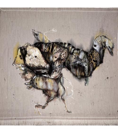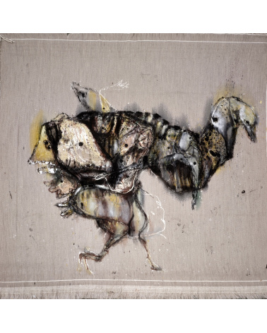 For this edition, we will present the first double-sided tapestry created specifically by Lionel Sabatté for Art Paris. Long fascinated by the immediacy of Paleolithic cave art, Lionel Sabatté has engaged with this technique by seeking to deconstruct it. Refusing to view tapestry as a mere mechanical reproduction of a motif through the crossing of wool and paper threads, Sabatté enriches the surface of the fabric with acrylic-painted figures, marks made using simple dried petroleum patties collected from beaches, and fishing-net threads tied into knots resembling fantastical bestiaries. The original motif seems absorbed and overlaid by multiple layers from which animal figures emerge, intertwine, and reappear differently on the other side of the tapestry. Visible from both sides and suspended like a sculpture, the work offers on each face a distinct composition, even as these figurative projections evoke the drawings found on Paleolithic cave walls.