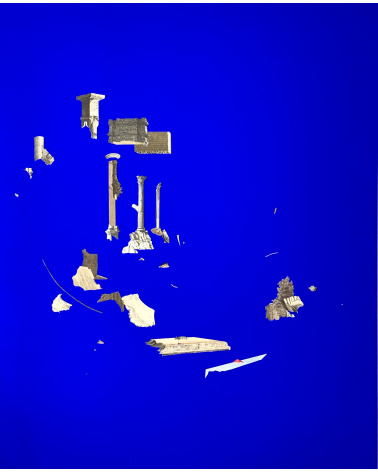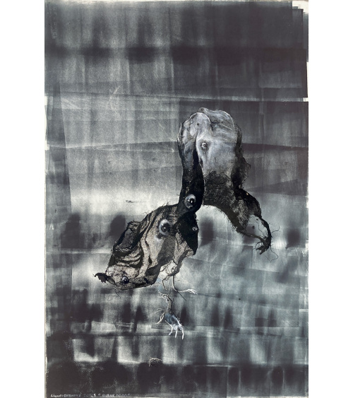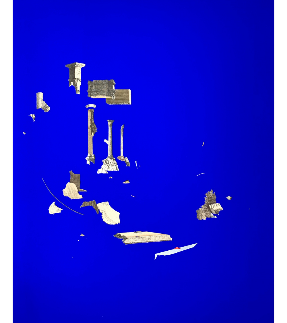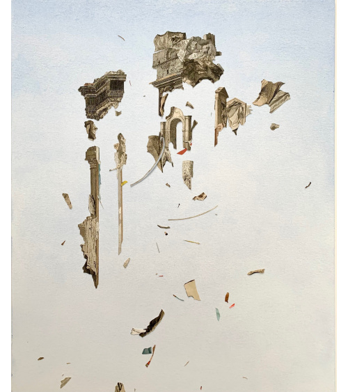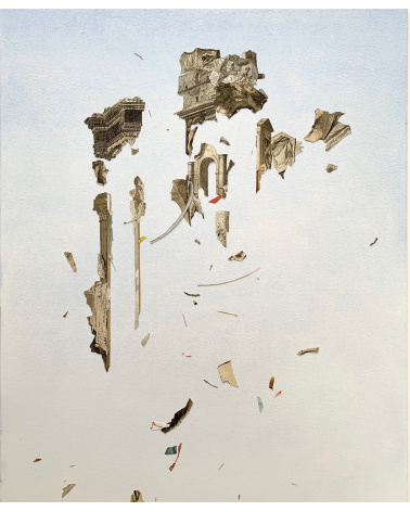 As a counterpoint, we present the latest tapestries by Lionel Sabatté, nominated for the 2025 Marcel Duchamp Prize. Through this extraordinary creation, he reinvents the very idea of a classical technique by enhancing the weaving with acrylic-painted figures and a play of added threads forming knots that resemble a fantastical bestiary. The ensemble is completed by drawings on paper in which he deploys a whole imaginary world playing on the intertwining of motifs. This same distanced relationship with the foundations of Western art is found in Gilles Pourtier's marble sculptures. Like masks from a primitive civilisation, these works also assert their close relationship with the industrial aesthetics that surround us in everyday life. Finally, following her impressive exhibition this summer at the Domaine de Chaumont sur Loire and foreshadowing her upcoming retrospective at the Frac d'Amiens, Claire Trotignon presents her latest collages based on old drawings and engravings. These landscapes, where emptiness reigns supreme, display a series of ruins that seem to belong as much to the most ancient past as to a future that is already obsolete. The presentation is complemented by a new series of drawings by the Sœurs Chevalme. This artist duo, residents of Villa Albertine in the USA, develops a committed multidisciplinary practice that questions the relationship between Western and African culture.