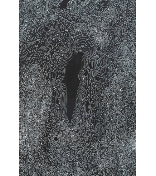 Strongly influenced by the codes of cartography, the graphic language of science fiction comics, scientific imagery of the microcosm, and the practice of line in 18th-century engraving, the artist proposes configurations in which each image unfolds through almost antinomic layers of figuration, with ruptures in scale and ambiguous relationships to reality.