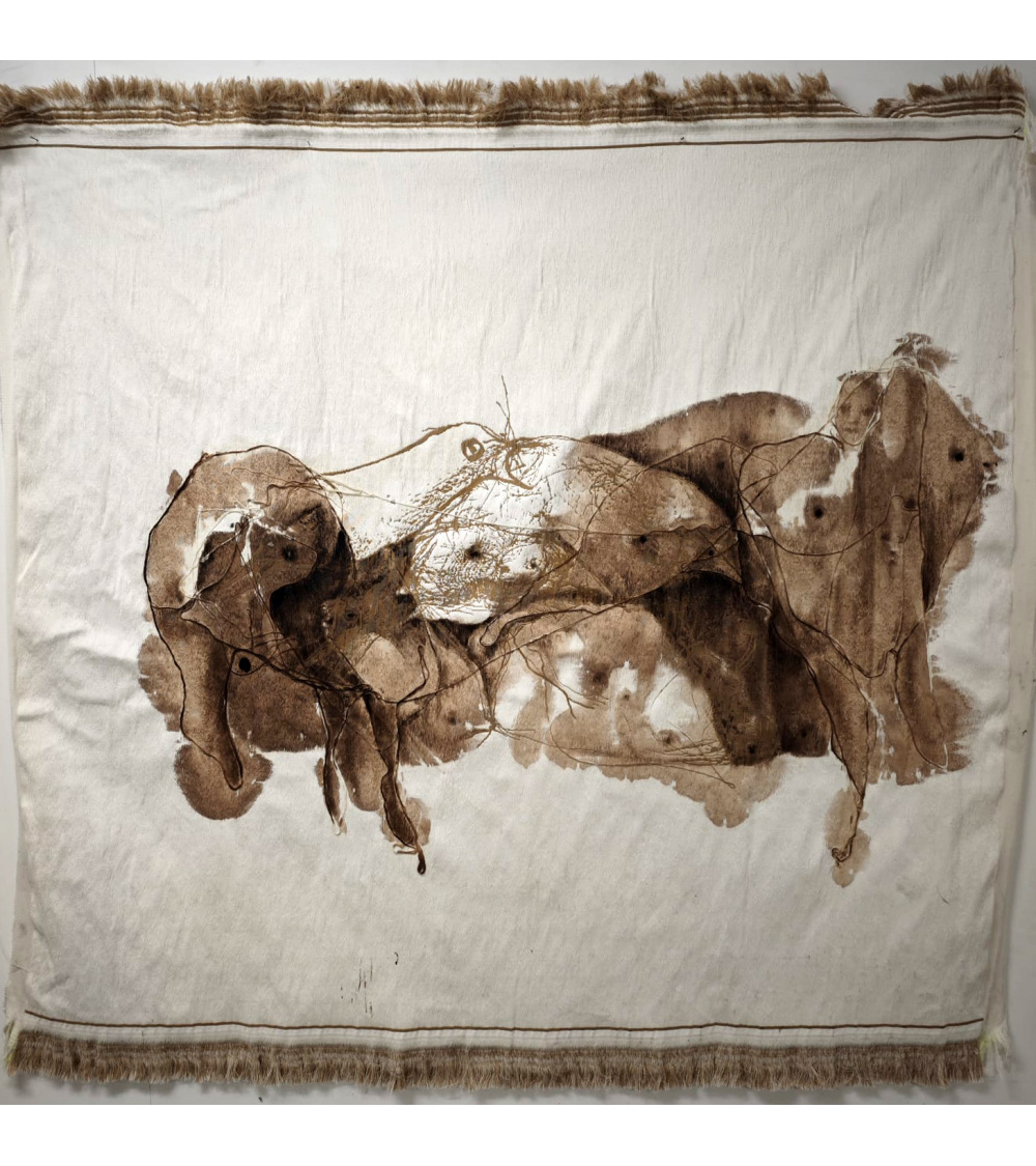 For the first time, Lionel Sabatté has ventured into the realm of tapestry, but a tapestry in which a simple embroidered motif is covered by a series of pictorial gestures. These gestures give rise to a dreamlike world in which a whole bestiary from the depths of history intertwines with an exploration of the materiality of painting. With the mysterious art of Neanderthals as his horizon, art that sketches a communion between man and living beings, Lionel Sabatté pursues here, with unparalleled breadth, a quest aimed at renewing genres in contemporary art.