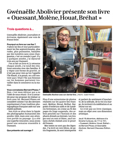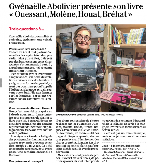Gwenaëlle Abolivier, ouessantine de cœur, accompagne ces œuvres par ses mots délicats, permettant au lecteur une immersion totale sur ces îles où le monde semble suspendu et hors du temps.