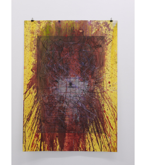 Depuis 1960, Hermann Nitsch (né en 1938 à Vienne) interroge les mythes de la culture européenne et notamment ceux liés au socle occidental : la religion chrétienne. Ses performances affirment un caractère liturgique fort où peinture, musique et théâtre sont intimement liés, rejouant sur un mode symbolique les mystères des origines. Une volonté de synthèse des arts qui prend toute sa dimension avec la définition de ce qu’il nomme le "Théâtre des Orgies et des Mystères". Le dessin occupe chez Nitsch une place particulière. Ce qu’Hermann Nitsch nomme dessins architecturaux se présente comme des sortes de cartes abstraites. Le trait semble y creuser l’esquisse d’un plan, sorte de ville ou territoire imaginaire.