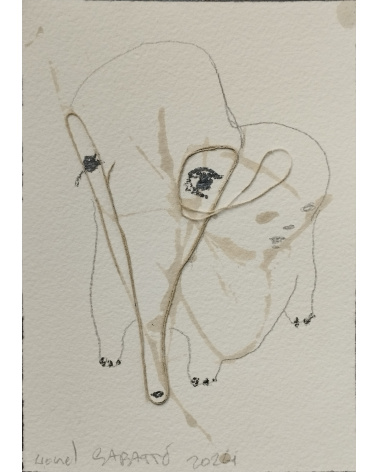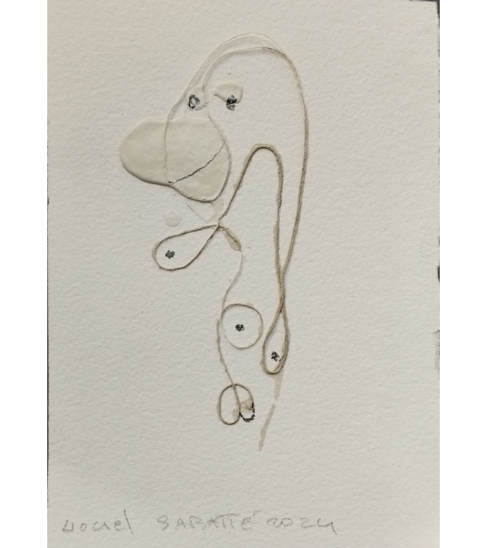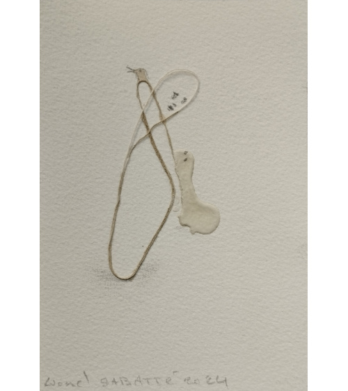 - Dessin au crayon sur papier rehaussé de fils collés et d’acrylique