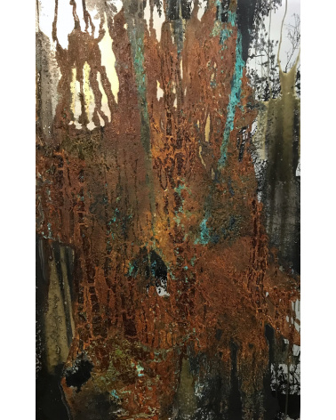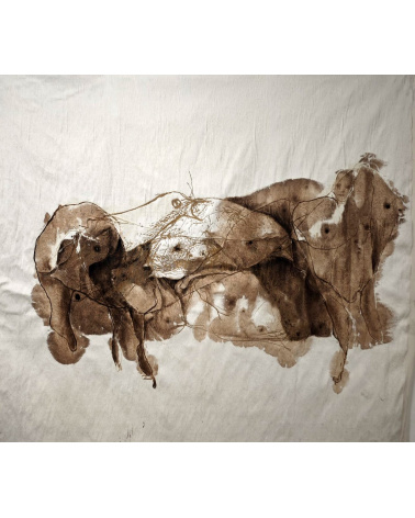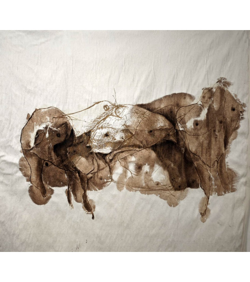 Encre, brou de noix, huile sur papier macule