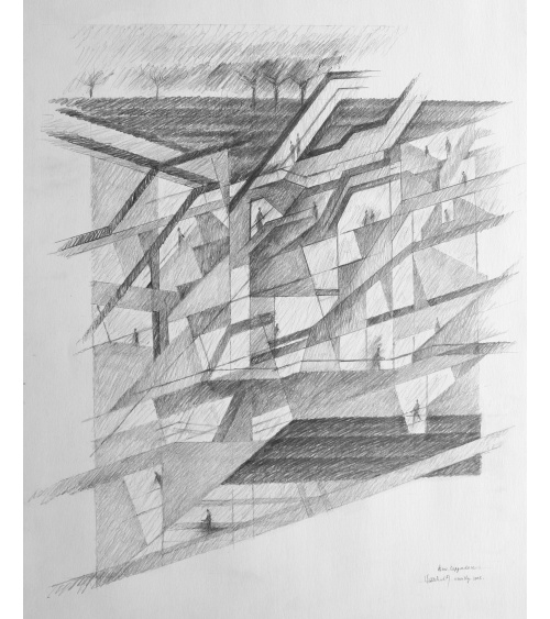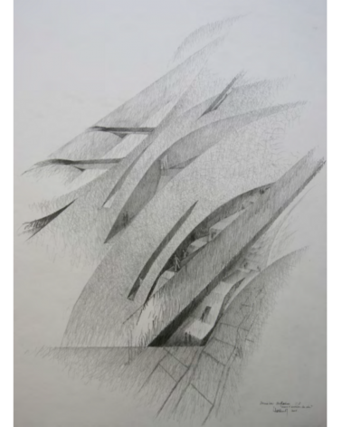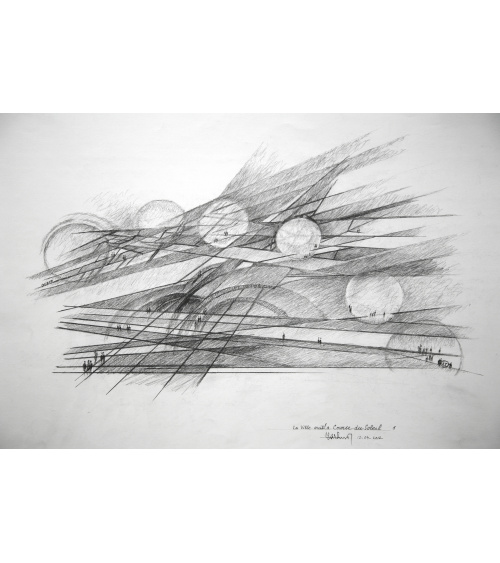Devant l’urgence de la question du vivre en commun, devant l’inquiétante réduction des possibles de notre planète avec son réchauffement climatique, avec sa nécessaire interrogation sur ce qu’implique la croissance, ce qu’est un territoire, une ville, voire une simple bâtisse, nous ont poussé à mettre en focus un ensemble méconnu de dessins originaux de Claude Parent (1923-2016). Reconnu comme l’un des architectes théoriciens les plus novateurs des années 1970-2000, figure historique de l’architecture, Claude Parent a la particularité rare d’avoir été tout à la fois un artiste et un architecte. Cette part de son travail, véritable prolongement plastique de ses réflexions sur la place de l’homme dans le monde, sur le rôle des migrations, la possibilité d’investir le sous-sol de nos territoires, reste encore largement méconnus du grand public. Pour cette occasion, nous présenterons plusieurs ensembles de dessins et d’encres des années 2000-2010, tous restés dans le fond privé de ses héritiers. Véritable révélation dévoilant une pensée iconoclaste, ces mines de plomb ou encre de chine, s’apparentent à des extrapolations libres d’une architecture devenue paysage, parfois très stylisées, voire abstraites. Loin d’être des illustrations, les dessins de Claude Parent sont chargés de puissance, de messages, et parfois même de colère. Ils constituent, à côté de l’œuvre architecturale, une œuvre artistique à part entière.